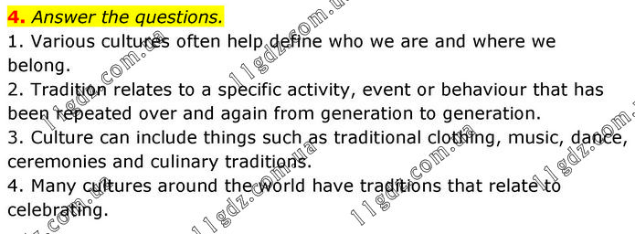 4. Answer the questions. 1. Various cultures often help define who we are and where we belong. 2. Tradition relates to a specific activity, event or behaviour that has been repeated over and again from generation to generation. 3. Culture can include things such as traditional clothing, music, dance, ceremonies and culinary traditions. 4. Many cultures around the world have traditions that relate to celebrating.