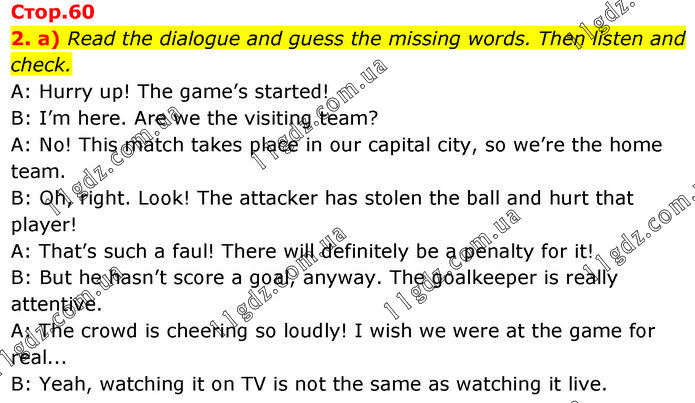 a) Read the dialogue and guess the missing words. Then listen and check. A: Hurry up! The game’s started! B: I’m here. Are we the visiting team? A: No! This match takes place in our capital city, so we’re the home team. B: Oh, right. Look! The attacker has stolen the ball and hurt that player! A: That’s such a faul! There will definitely be a penalty for it! B: But he hasn’t score a goal, anyway. The goalkeeper is really attentive. A: The crowd is cheering so loudly! I wish we were at the game for real... B: Yeah, watching it on TV is not the same as watching it live.
