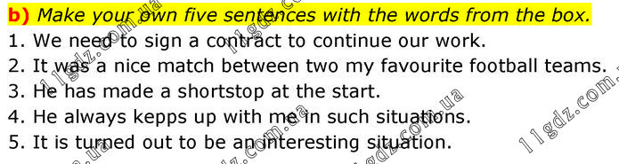 b) Make your own five sentences with the words from the box. 1. We need to sign a contract to continue our work. 2. It was a nice match between two my favourite football teams. 3. He has made a shortstop at the start. 4. He always kepps up with me in such situations. 5. It is turned out to be an interesting situation.