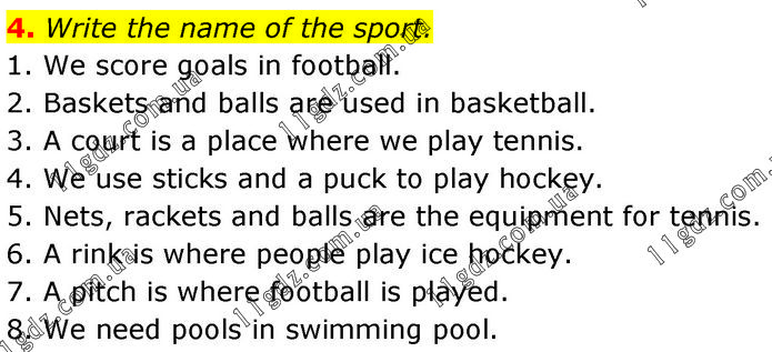 Write the name of the sport. 1. We score goals in football. 2. Baskets and balls are used in basketball. 3. A court is a place where we play tennis. 4. We use sticks and a puck to play hockey. 5. Nets, rackets and balls are the equipment for tennis. 6. A rink is where people play ice hockey. 7. A pitch is where football is played. 8. We need pools in swimming pool.