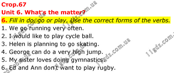 Unit 6. What's the matter? 6. Fill in do, go or play. Use the correct forms of the verbs. 1. We go running very often. 2. I would like to play cycle ball. 3. Helen is planning to go skating. 4. George can do a very high jump. 5. My sister loves doing gymnastics. 6. Ed and Ann don’t want to play rugby.
