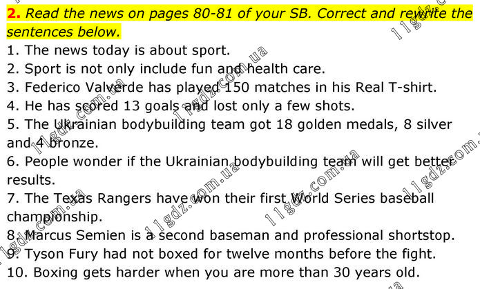 2. Read the news on pages 80–81 of your SB. Correct and rewrite the sentences below. 1. The news today is about sport. 2. Sport is not only include fun and health care. 3. Federico Valverde has played 150 matches in his Real T–shirt. 4. He has scored 13 goals and lost only a few shots. 5. The Ukrainian bodybuilding team got 18 golden medals, 8 silver and 4 bronze. 6. People wonder if the Ukrainian bodybuilding team will get better results. 7. The Texas Rangers have won their first World Series baseball championship. 8. Marcus Semien is a second baseman and professional shortstop. 9. Tyson Fury had not boxed for twelve months before the fight. 10. Boxing gets harder when you are more than 30 years old.