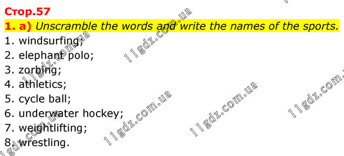 1. a) Unscramble the words and write the names of the sports. 1. windsurfing; 2. elephant polo; 3. zorbing; 4. athletics; 5. cycle ball; 6. underwater hockey; 7. weightlifting; 8. wrestling.