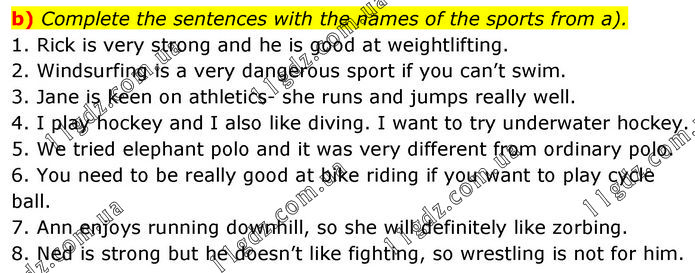 b) Complete the sentences with the names of the sports from a). 1. Rick is very strong and he is good at weightlifting. 2. Windsurfing is a very dangerous sport if you can’t swim. 3. Jane is keen on athletics– she runs and jumps really well. 4. I play hockey and I also like diving. I want to try underwater hockey. 5. We tried elephant polo and it was very different from ordinary polo. 6. You need to be really good at bike riding if you want to play cycle ball. 7. Ann enjoys running downhill, so she will definitely like zorbing. 8. Ned is strong but he doesn’t like fighting, so wrestling is not for him.