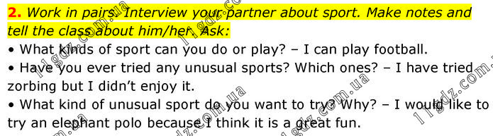 2. Work in pairs. Interview your partner about sport. Make notes and tell the class about him/her. Ask: • What kinds of sport can you do or play? – I can play football. • Have you ever tried any unusual sports? Which ones? – I have tried zorbing but I didn’t enjoy it. • What kind of unusual sport do you want to try? Why? – I would like to try an elephant polo because I think it is a great fun.