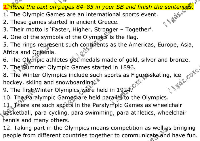 2. Read the text on pages 84–85 in your SB and finish the sentences. 1. The Olympic Games are an international sports event. 2. These games started in ancient Greece. 3. Their motto is ‘Faster, Higher, Stronger – Together’. 4. One of the symbols of the Olympics is the flag. 5. The rings represent such continents as the Americas, Europe, Asia, Africa and Oceania. 6. The Olympic athletes get medals made of gold, silver and bronze. 7. The Summer Olympic Games started in 1896. 8. The Winter Olympics include such sports as Figure skating, ice hockey, skiing and snowboarding. 9. The first Winter Olympics were held in 1924. 10. The Paralympic Games are held parallel to the Olympics. 11. There are such sports in the Paralympic Games as wheelchair basketball, para cycling, para swimming, para athletics, wheelchair tennis and many others. 12. Taking part in the Olympics means competition as well as bringing people from different countries together to communicate and have fun.