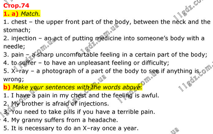 a) Match. 1. chest – the upper front part of the body, between the neck and the stomach; 2. injection – an act of putting medicine into someone’s body with a needle; 3. pain – a sharp uncomfortable feeling in a certain part of the body; 4. to suffer – to have an unpleasant feeling or difficulty; 5. X–ray – a photograph of a part of the body to see if anything is wrong; b) Make your sentences with the words above. 1. I have a pain in my chest and the feeling is awful. 2. My brother is afraid of injections. 3. You need to take pills if you have a terrible pain. 4. My granny suffers from a headache. 5. It is necessary to do an X–ray once a year.