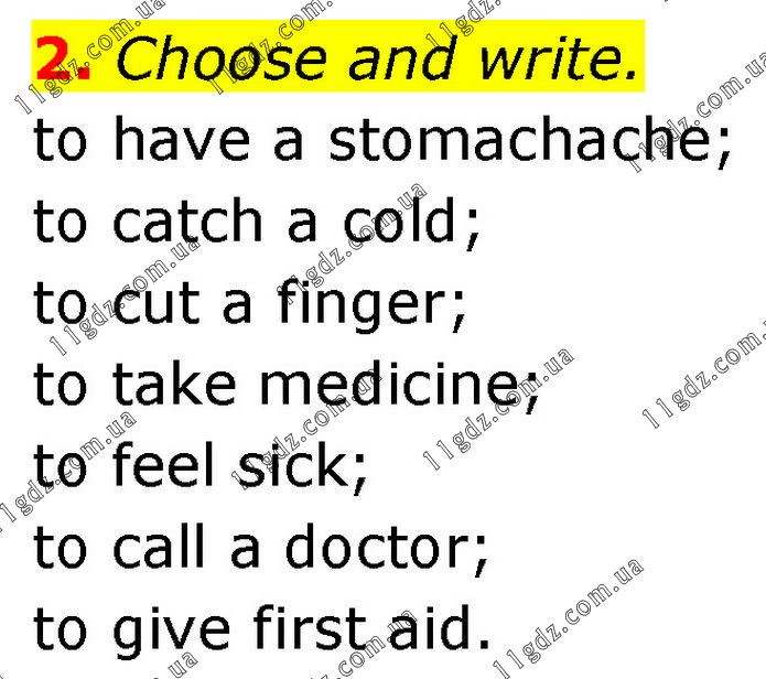 Choose and write. to have a stomachache; to catch a cold; to cut a finger; to take medicine; to feel sick; to call a doctor; to give first aid.