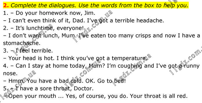 Complete the dialogues. Use the words from the box to help you. 1. – Do your homework now, Jim. – I can’t even think of it, Dad. I’ve got a terrible headache. 2. – It’s lunchtime, everyone! – I don’t want lunch, Mum. I’ve eaten too many crisps and now I have a stomachache. 3. – I feel terrible. – Your head is hot. I think you’ve got a temperature. 4. – Can I stay at home today, Mum? I’m coughing and I’ve got a runny nose. – Hmm. You have a bad cold. OK. Go to bed! 5. – I have a sore throat, Doctor. – Open your mouth ... Yes, of course, you do. Your throat is all red.