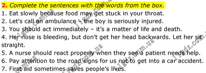Complete the sentences with the words from the box. 1. Eat slowly because food may get stuck in your throat. 2. Let’s call an ambulance – the boy is seriously injured. 3. You should act immediately – it’s a matter of life and death. 4. Her nose is bleeding, but don’t get her head backwards. Let her sit straight. 5. A nurse should react properly when they see a patient needs help. 6. Pay attention to the road signs for us not to get into a car accident. 7. First aid sometimes saves people’s lives.