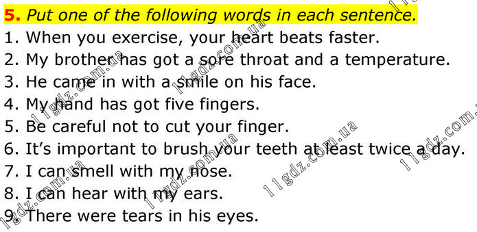 Put one of the following words in each sentence. 1. When you exercise, your heart beats faster. 2. My brother has got a sore throat and a temperature. 3. He came in with a smile on his face. 4. My hand has got five fingers. 5. Be careful not to cut your finger. 6. It’s important to brush your teeth at least twice a day. 7. I can smell with my nose. 8. I can hear with my ears. 9. There were tears in his eyes.