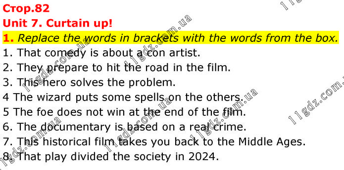 Unit 7. Curtain up! 1. Replace the words in brackets with the words from the box. 1. That comedy is about a con artist. 2. They prepare to hit the road in the film. 3. This hero solves the problem. 4 The wizard puts some spells on the others. 5 The foe does not win at the end of the film. 6. The documentary is based on a real crime. 7. This historical film takes you back to the Middle Ages. 8. That play divided the society in 2024.