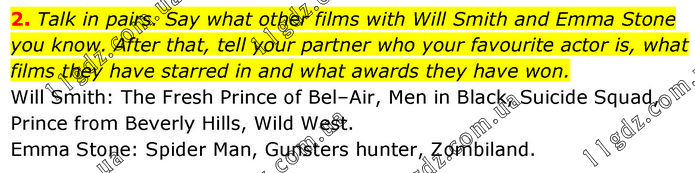 Talk in pairs. Say what other films with Will Smith and Emma Stone you know. After that, tell your partner who your favourite actor is, what films they have starred in and what awards they have won. Will Smith: The Fresh Prince of Bel–Air, Men in Black, Suicide Squad, Prince from Beverly Hills, Wild West. Emma Stone: Spider Man, Gunsters hunter, Zombiland.
