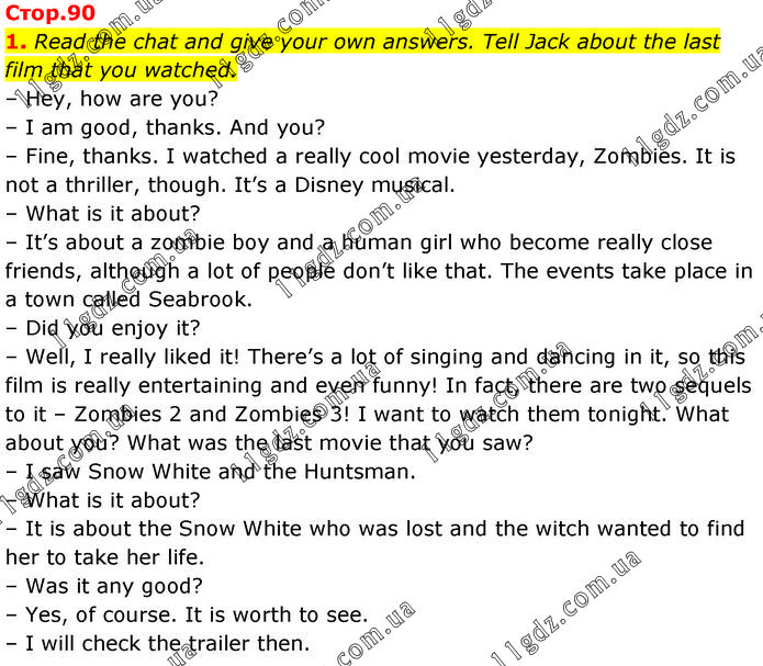 Read the chat and give your own answers. Tell Jack about the last film that you watched. – Hey, how are you? – I am good, thanks. And you? – Fine, thanks. I watched a really cool movie yesterday, Zombies. It is not a thriller, though. It’s a Disney musical. – What is it about? – It’s about a zombie boy and a human girl who become really close friends, although a lot of people don’t like that. The events take place in a town called Seabrook. – Did you enjoy it? – Well, I really liked it! There’s a lot of singing and dancing in it, so this film is really entertaining and even funny! In fact, there are two sequels to it – Zombies 2 and Zombies 3! I want to watch them tonight. What about you? What was the last movie that you saw? – I saw Snow White and the Huntsman. – What is it about? – It is about the Snow White who was lost and the witch wanted to find her to take her life. – Was it any good? – Yes, of course. It is worth to see. – I will check the trailer then.