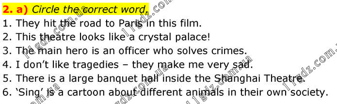 a) Circle the correct word. 1. They hit the road to Paris in this film. 2. This theatre looks like a crystal palace! 3. The main hero is an officer who solves crimes. 4. I don’t like tragedies – they make me very sad. 5. There is a large banquet hall inside the Shanghai Theatre. 6. ‘Sing’ is a cartoon about different animals in their own society.