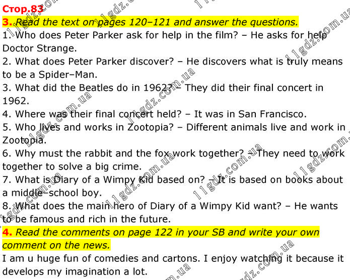 3. Read the text on pages 120–121 and answer the questions. 1. Who does Peter Parker ask for help in the film? – He asks for help Doctor Strange. 2. What does Peter Parker discover? – He discovers what is truly means to be a Spider–Man. 3. What did the Beatles do in 1962? – They did their final concert in 1962. 4. Where was their final concert held? – It was in San Francisco. 5. Who lives and works in Zootopia? – Different animals live and work in Zootopia. 6. Why must the rabbit and the fox work together? – They need to work together to solve a big crime. 7. What is Diary of a Wimpy Kid based on? – It is based on books about a middle–school boy. 8. What does the main hero of Diary of a Wimpy Kid want? – He wants to be famous and rich in the future. 4. Read the comments on page 122 in your SB and write your own comment on the news. I am u huge fun of comedies and cartons. I enjoy watching it because it develops my imagination a lot.