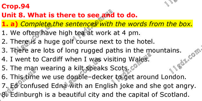 Unit 8. What is there to see and to do. 1. a) Complete the sentences with the words from the box. 1. We often have high tea at work at 4 pm. 2. There is a huge golf course next to the hotel. 3. There are lots of long rugged paths in the mountains. 4. I went to Cardiff when I was visiting Wales. 5. The man wearing a kilt speaks Scots. 6. This time we use double–decker to get around London. 7. Ed confused Edna with an English joke and she got angry. 8. Edinburgh is a beautiful city and the capital of Scotland.