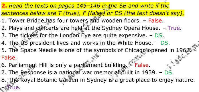 Read the texts on pages 145–146 in the SB and write if the sentences below are T (true), F (false) or DS (the text doesn’t say). 1. Tower Bridge has four towers and wooden floors. – False. 2. Plays and concerts are held at the Sydney Opera House. – True. 3. The tickets for the London Eye are quite expensive. – DS. 4. The US president lives and works in the White House. – DS. 5. The Space Needle is one of the symbols of Chicago opened in 1962. – False. 6. Parliament Hill is only a parliament building. – False. 7. The Response is a national war memorial built in 1939. – DS. 8. The Royal Botanic Garden in Sydney is a great place to enjoy nature. – True.