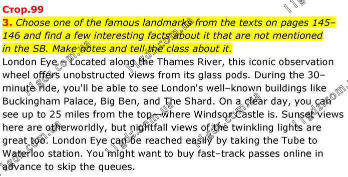 Choose one of the famous landmarks from the texts on pages 145–146 and find a few interesting facts about it that are not mentioned in the SB. Make notes and tell the class about it. London Eye – Located along the Thames River, this iconic observation wheel offers unobstructed views from its glass pods. During the 30–minute ride, you'll be able to see London's well–known buildings like Buckingham Palace, Big Ben, and The Shard. On a clear day, you can see up to 25 miles from the top—where Windsor Castle is. Sunset views here are otherworldly, but nightfall views of the twinkling lights are great too. London Eye can be reached easily by taking the Tube to Waterloo station. You might want to buy fast–track passes online in advance to skip the queues.