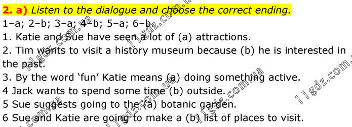 Listen to the dialogue and choose the correct ending. 1–a; 2–b; 3–a; 4–b; 5–a; 6–b. 1. Katie and Sue have seen a lot of (a) attractions. 2. Tim wants to visit a history museum because (b) he is interested in the past. 3. By the word ‘fun’ Katie means (a) doing something active. 4 Jack wants to spend some time (b) outside. 5 Sue suggests going to the (a) botanic garden. 6 Sue and Katie are going to make a (b) list of places to visit.