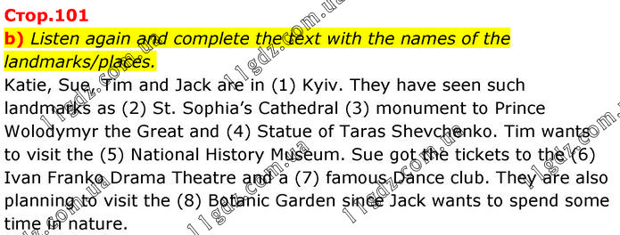 Listen again and complete the text with the names of the landmarks/places. Katie, Sue, Tim and Jack are in (1) Kyiv. They have seen such landmarks as (2) St. Sophia’s Cathedral (3) monument to Prince Wolodymyr the Great and (4) Statue of Taras Shevchenko. Tim wants to visit the (5) National History Museum. Sue got the tickets to the (6) Ivan Franko Drama Theatre and a (7) famous Dance club. They are also planning to visit the (8) Botanic Garden since Jack wants to spend some time in nature.