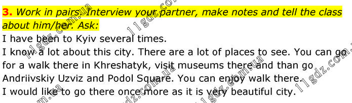 Work in pairs. Interview your partner, make notes and tell the class about him/her. Ask: I have been to Kyiv several times. I know a lot about this city. There are a lot of places to see. You can go for a walk there in Khreshatyk, visit museums there and than go Andriivskiy Uzviz and Podol Square. You can enjoy walk there. I would like to go there once more as it is very beautiful city.