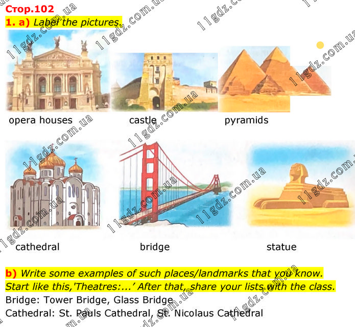 a) Label the pictures. opera houses castle pyramids cathedral bridge statue b) Write some examples of such places/landmarks that you know. Start like this,'Theatres:...’ After that, share your lists with the class. Bridge: Tower Bridge, Glass Bridge. Cathedral: St. Pauls Cathedral, St. Nicolaus Cathedral.