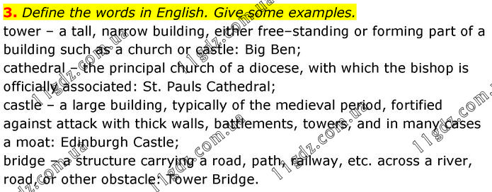 Define the words in English. Give some examples. tower – a tall, narrow building, either free–standing or forming part of a building such as a church or castle: Big Ben; cathedral – the principal church of a diocese, with which the bishop is officially associated: St. Pauls Cathedral; castle – a large building, typically of the medieval period, fortified against attack with thick walls, battlements, towers, and in many cases a moat: Edinburgh Castle; bridge – a structure carrying a road, path, railway, etc. across a river, road, or other obstacle: Tower Bridge.