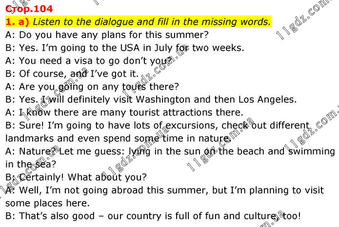 Listen to the dialogue and fill in the missing words. A: Do you have any plans for this summer? B: Yes. I’m going to the USA in July for two weeks. A: You need a visa to go don’t you? B: Of course, and I’ve got it. A: Are you going on any tours there? B: Yes. I will definitely visit Washington and then Los Angeles. A: I know there are many tourist attractions there. B: Sure! I’m going to have lots of excursions, check out different landmarks and even spend some time in nature. A: Nature? Let me guess: lying in the sun on the beach and swimming in the sea? B: Certainly! What about you? A: Well, I’m not going abroad this summer, but I’m planning to visit some places here. B: That’s also good – our country is full of fun and culture, too!