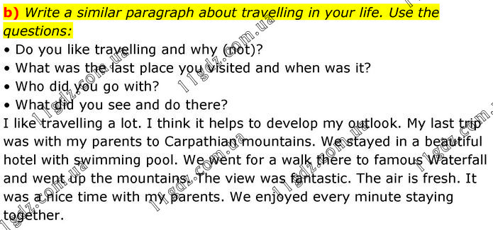 Write a similar paragraph about travelling in your life. Use the questions: • Do you like travelling and why (not)? • What was the last place you visited and when was it? • Who did you go with? • What did you see and do there? I like travelling a lot. I think it helps to develop my outlook. My last trip was with my parents to Carpathian mountains. We stayed in a beautiful hotel with swimming pool. We went for a walk there to famous Waterfall and went up the mountains. The view was fantastic. The air is fresh. It was a nice time with my parents. We enjoyed every minute staying together.