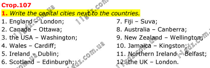 Write the capital cities next to the countries. 1. England – London; 2. Canada – Ottawa; 3. the USA – Washington; 4. Wales – Cardiff; 5. Ireland – Dublin; 6. Scotland – Edinburgh; 7. Fiji – Suva; 8. Australia – Canberra; 9. New Zealand – Wellington; 10. Jamaica – Kingston; 11. Northern Ireland – Belfast; 12. the UK – London.