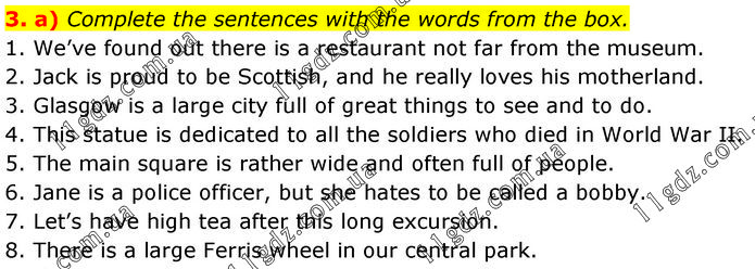 Complete the sentences with the words from the box. 1. We’ve found out there is a restaurant not far from the museum. 2. Jack is proud to be Scottish, and he really loves his motherland. 3. Glasgow is a large city full of great things to see and to do. 4. This statue is dedicated to all the soldiers who died in World War II. 5. The main square is rather wide and often full of people. 6. Jane is a police officer, but she hates to be called a bobby. 7. Let’s have high tea after this long excursion. 8. There is a large Ferris wheel in our central park.
