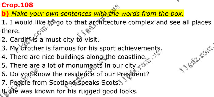 Make your own sentences with the words from the box. 1. I would like to go to that architecture complex and see all places there. 2. Cardiff is a must city to visit. 3. My brother is famous for his sport achievements. 4. There are nice buildings along the coastline. 5. There are a lot of monuments in our city. 6. Do you know the residence of our President? 7. People from Scotland speaks Scots. 8. He was known for his rugged good looks.