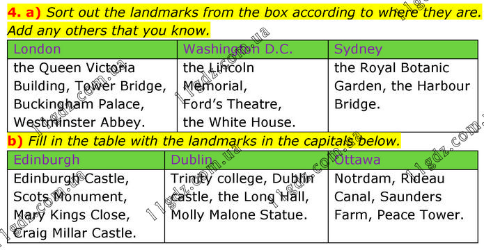 a) Sort out the landmarks from the box according to where they are. Add any others that you know. London Washington D.C. Sydney the Queen Victoria Building, Tower Bridge, Buckingham Palace, Westminster Abbey. the Lincoln Memorial, Ford’s Theatre, the White House. the Royal Botanic Garden, the Harbour Bridge. b) Fill in the table with the landmarks in the capitals below. Edinburgh Dublin Ottawa Edinburgh Castle, Scots Monument, Mary Kings Close, Craig Millar Castle. Trinity college, Dublin castle, the Long Hall, Molly Malone Statue. Notrdam, Rideau Canal, Saunders Farm, Peace Tower.