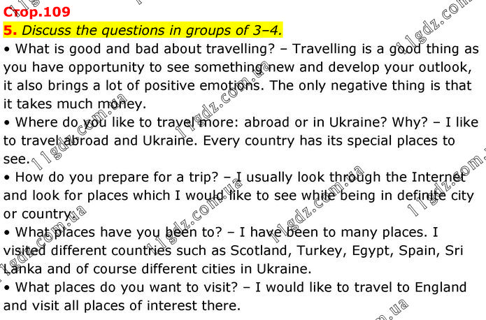 Discuss the questions in groups of 3–4. • What is good and bad about travelling? – Travelling is a good thing as you have opportunity to see something new and develop your outlook, it also brings a lot of positive emotions. The only negative thing is that it takes much money. • Where do you like to travel more: abroad or in Ukraine? Why? – I like to travel abroad and Ukraine. Every country has its special places to see. • How do you prepare for a trip? – I usually look through the Internet and look for places which I would like to see while being in definite city or country. • What places have you been to? – I have been to many places. I visited different countries such as Scotland, Turkey, Egypt, Spain, Sri Lanka and of course different cities in Ukraine. • What places do you want to visit? – I would like to travel to England and visit all places of interest there.