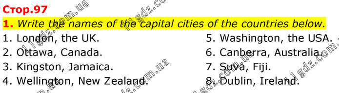 Write the names of the capital cities of the countries below. 1. London, the UK. 2. Ottawa, Canada. 3. Kingston, Jamaica. 4. Wellington, New Zealand. 5. Washington, the USA. 6. Canberra, Australia. 7. Suva, Fiji. 8. Dublin, Ireland.
