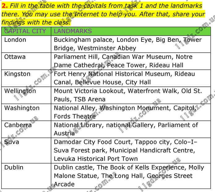Fill in the table with the capitals from task 1 and the landmarks there. You may use the Internet to help you. After that, share your findings with the class. CAPITAL CITY LANDMARKS London Buckingham palace, London Eye, Big Ben, Tower Bridge, Westminster Abbey. Ottawa Parliament Hill, Canadian War Museum, Notre Dame Cathedral, Peace Tower, Rideau Hall. Kingston Fort Henry National Historical Museum, Rideau Canal, Bellevue House, City Hall. Wellington Mount Victoria Lookout, Waterfront Walk, Old St. Pauls, TSB Arena. Washington National Alley, Washington Monument, Capitol, Fords Theatre. Canberra National Library, national Gallery, Parliament of Austria. Suva Damodar City Food Court, Tappoo city, Colo–I–Suva Forest park, Municipal Handicraft Centre, Levuka Historical Port Town. Dublin Dublin castle, The Book of Kells Experience, Molly Malone Statue, The Long Hall, Georges Street Arcade.