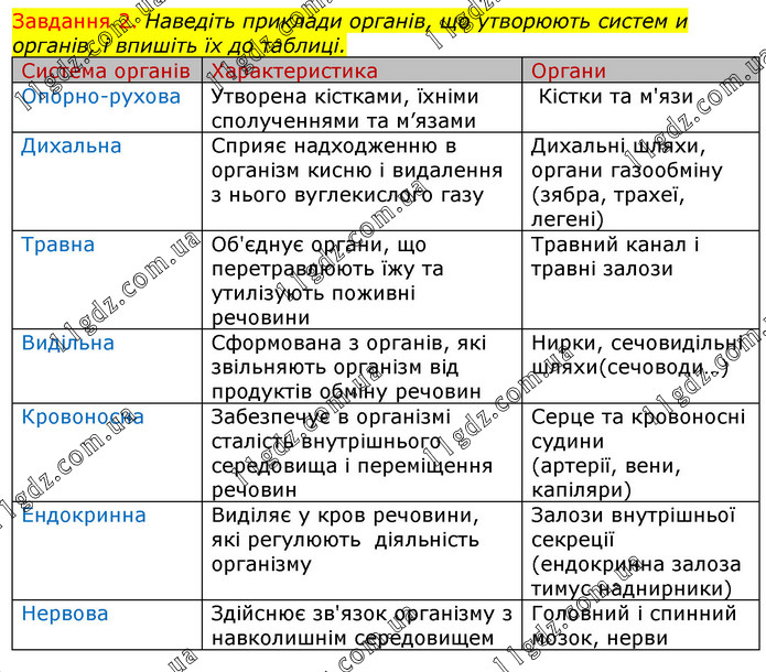 Наведіть приклади органів, що утворюють систем и органів, і впишіть їх до таблиці. Система органів Характеристика Органи Опорно-рухова Утворена кістками, їхніми сполученнями та м’язами Кістки та м'язи Дихальна Сприяє надходженню в організм кисню і видалення з нього вуглекислого газу Дихальні шляхи, органи газообміну (зябра, трахеї, легені)