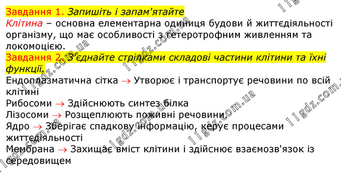 Завдання 1. Запишіть і запам'ятайте Клітина – основна елементарна одиниця будови й життєдіяльності організму, що має особливості з гетеротрофним живленням та локомоцією. Завдання 2. З'єднайте стрілками складові частини клітини та їхні функції. Ендоплазматична сітка