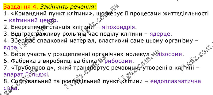 Завдання 4. Закінчить речення: 1. «Командний пункт клітини», що керує її процесами життєдіяльності 3. Відіграє важливу роль під час поділу клітини – 2. Енергетична станція клітини – 4. Зберігає спадковий матеріал, властивий саме цьому організму – 5. Бере участь у розщепленні органічних молекул –