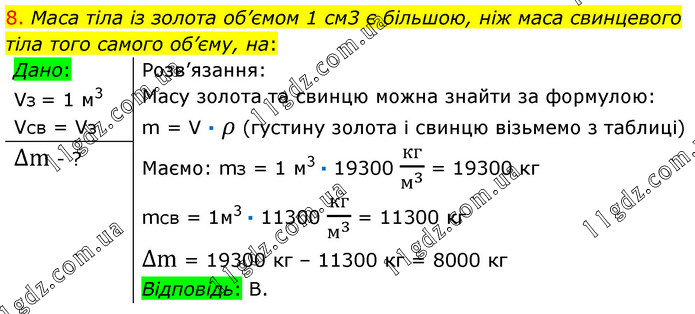 Маса тіла із золота об’ємом 1 см3 є більшою, ніж маса свинцевого тіла того самого об’єму, на: Розв’язання: Масу золота та свинцю можна знайти за формулою: m = V ∙ ρ (густину золота і свинцю візьмемо з таблиці) Маємо: mз = 1 м3 ∙ 19300 кг/м^3 = 19300 кг mсв = 1м3 ∙ 11300 кг/м^3 = 11300 кг ∆m = 19300 кг – 11300 кг = 8000 кг Відповідь: В.