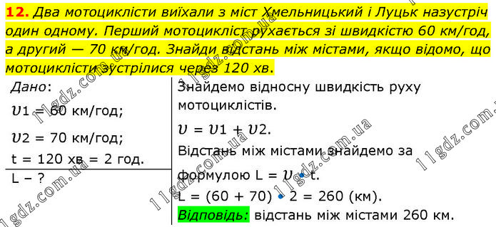 Два мотоциклісти виїхали з міст Хмельницький і Луцьк назустріч один одному. Перший мотоцикліст рухається зі швидкістю 60 км/год, а другий — 70 км/год. Знайди відстань між містами, якщо відомо, що мотоциклісти зустрілися через 120 хв. Дано: υ1 = 60 км/год; υ2 = 70 км/год; t = 120 хв = 2 год. Знайдемо відносну швидкість руху мотоциклістів. υ = υ1 + υ2. Відстань між містами знайдемо за формулою L = υ • t. L = (60 + 70) • 2 = 260 (км). Відповідь: відстань між містами 260 км. L – ?
