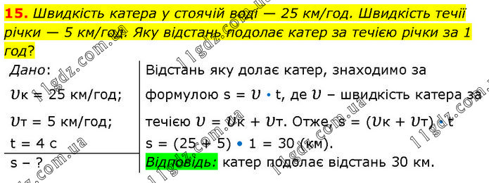 Швидкість катера у стоячій воді — 25 км/год. Швидкість течії річки — 5 км/год. Яку відстань подолає катер за течією річки за 1 год? Дано: υк = 25 км/год; υт = 5 км/год; t = 4 с Відстань яку долає катер, знаходимо за формулою s = υ • t, де υ – швидкість катера за течією υ = υк + υт. Отже, s = (υк + υт) • t s = (25 + 5) • 1 = 30 (км). Відповідь: катер подолає відстань 30 км. s – ?