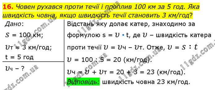 Човен рухався проти течії і проплив 100 км за 5 год. Яка швидкість човна, якщо швидкість течії становить 3 км/год? Дано: s = 100 км; υт = 3 км/год; t = 5 год Відстань яку долає катер, знаходимо за формулою s = υ • t, де υ – швидкість катера проти течії υ = υч – υт. Отже, υ = s∶t υ = 100 : 5 = 20 (км/год). υч = υ + υт = 20 + 3 = 23 (км/год). Відповідь: швидкість човна 23 км/год. υч – ?