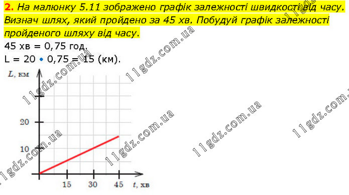 На малюнку 5.11 зображено графік залежності швидкості від часу. Визнач шлях, який пройдено за 45 хв. Побудуй графік залежності пройденого шляху від часу. 45 хв = 0,75 год. L = 20 • 0,75 = 15 (км).
