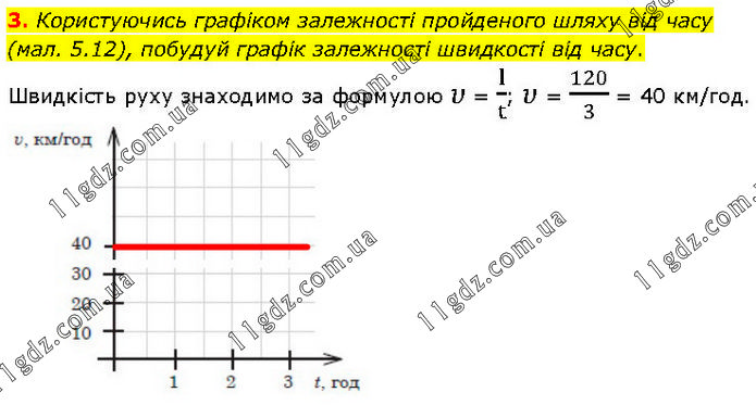 Користуючись графіком залежності пройденого шляху від часу (мал. 5.12), побудуй графік залежності швидкості від часу. Швидкість руху знаходимо за формулою υ = l/t; υ = 120/3 = 40 км/год.