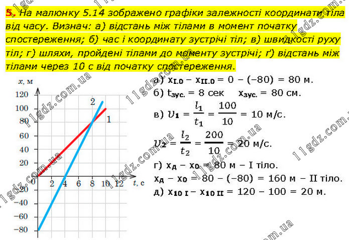На малюнку 5.14 зображено графіки залежності координати тіла від часу. Визнач: а) відстань між тілами в момент початку спостереження; б) час і координату зустрічі тіл; в) швидкості руху тіл; г) шляхи, пройдені тілами до моменту зустрічі; ґ) відстань між тілами через 10 с від початку спостереження. а) хІ.0 – хІІ.0 = 0 – (–80) = 80 м. б) tзус. = 8 сек хзус. = 80 см. в) υ1 = l_1/t_1 = 100/10 = 10 м/с. υ2 = l_2/t_2 = 200/10 = 20 м/с. г) хд – х0 = 80 м – І тіло. хд – х0 = 80 – (–80) = 160 м – ІІ тіло. д) х10 І – х10 ІІ = 120 – 100 = 20 м.