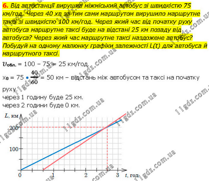 Від автостанції вирушив міжміський автобус зі швидкістю 75 км/год. Через 40 хв за тим сами маршрутом вирушило маршрутне таксі зі швидкістю 100 км/год. Через який час від початку руху автобуса маршрутне таксі буде на відстані 25 км позаду від автобуса? Через який час маршрутне таксі наздожене автобус? Побудуй на одному малюнку графіки залежності L(t) для автобуса й маршрутного таксі. υобл. = 100 – 75 = 25 км/год. х0 = 75 • 40/60 = 50 км – відстань між автобусом та таксі на початку руху. через 1 годину буде 25 км. через 2 години буде 0 км.