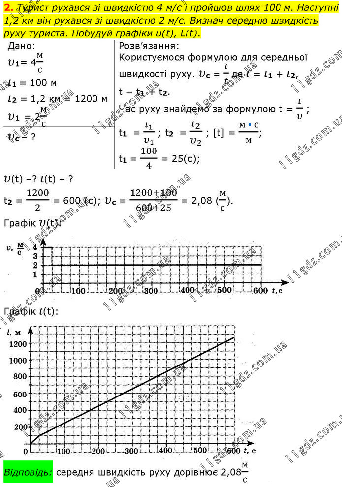 Турист рухався зі швидкістю 4 м/с і пройшов шлях 100 м. Наступні 1,2 км він рухався зі швидкістю 2 м/с. Визнач середню швидкість руху туриста. Побудуй графіки u(t), L(t). Дано: υ1= 4м/с ι1 = 100 м ι2 = 1,2 км = 1200 м υ1 = 2м/с Розв’язання: Користуємося формулою для середньої швидкості руху. υс = ι/t де ι = ι1 + ι2, t = t1 + t2. Час руху знайдемо за формулою t = ι/υ ; t1 = ι_1/υ_1 ; t2 = ι_2/υ_2 ; [t] = (м • с)/м; t1 = 100/4 = 25(с); υс – ? υ(t) –? ι(t) – ? t2 = 1200/2 = 600 (с); υс = (1200+100)/(600+25) = 2,08 (м/с). Графік υ(t):