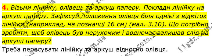 Візьми лінійку, олівець та аркуш паперу. Поклади лінійку на аркуш паперу. Зафіксуй положення олівця біля однієї з відміток лінійки (наприклад, на позначці 16 см) (мал. 3.10). Що потрібно зробити, щоб олівець був нерухомим і водночас залишав слід на аркуші паперу? Треба пересувати лінійку та аркуш відносно олівця.